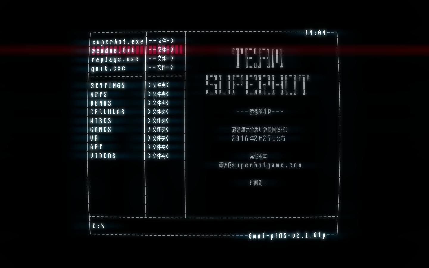 1.0漢化版:全文本漢化。僅支持2號(hào)升級(jí)擋。注:如果漢化后進(jìn)不去游戲,刪除C:\Users\用戶名\AppData\LocalLow\SUPERHOT_Team\SUPERHOT 下的super.hot文件即可