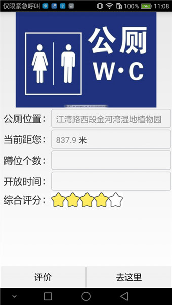 并且能夠顯示該位置的地址、蹲位個數(shù)、開放時間、公廁照片等詳情信息,