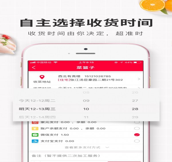 平臺(tái)提供近3000種高品質(zhì)產(chǎn)品,綠色葉菜、時(shí)令鮮果、現(xiàn)殺活魚(yú)、糧油米面、堅(jiān)果零食應(yīng)有盡有,3分鐘下單,上午定下午送,收貨時(shí)間有你決定,超準(zhǔn)時(shí)(準(zhǔn)確到分鐘)!
