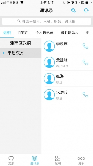 “津南政信通”是一款定位于組織使用的云服務,基于單位通訊錄的信息交互平臺,幫助政府機關建立全端(手機、PC、智能電話)的通訊及信息推送、信息交互的快速、立體的溝通平 臺,讓單位的通訊效率、溝通效率、文化建設效率、學習效率大幅提升。