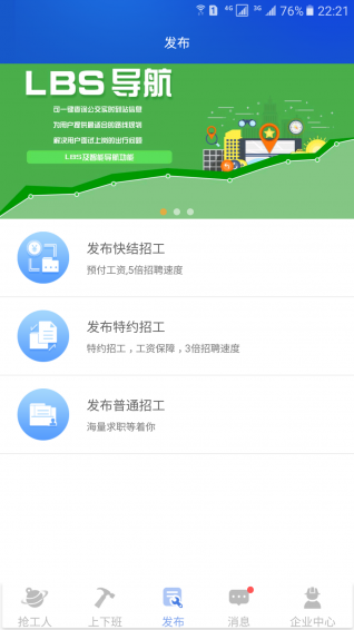 喂喂打工快結(jié)招工、特約內(nèi)招、特約外招的多入口招工方式,依托實名制監(jiān)管系統(tǒng)、反垃圾審核系統(tǒng)及人工審核系統(tǒng),實行先認(rèn)證方可發(fā)布。引入第三方支付機(jī)構(gòu)對用戶進(jìn)行實名考勤登記及監(jiān)管支付,真正做到招工找工信息真實可靠,工資完工即結(jié)算,解決勞務(wù)工資不可控的問題。【更新日志】