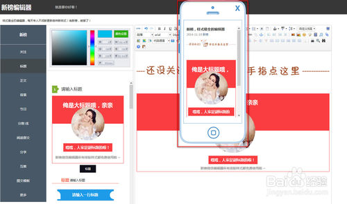 把編輯好的素材,或者選擇的素材,可以點(diǎn)擊最右邊的手機(jī)預(yù)覽按鈕,可以看看,素材在手機(jī)上面顯示是什么樣子的,怎么的排版,這樣可以更好的是用戶查看,校正。