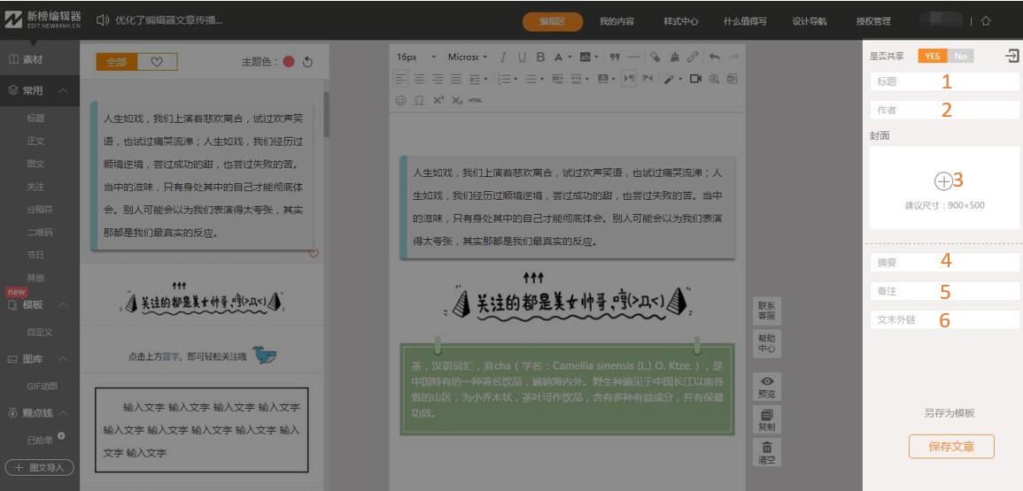 step2.在“信息展示區(qū)“依次輸入標(biāo)題、作者(前兩個是必填),如果需要同步到微信,則封面、摘要、外鏈等也可一并填入,最后點(diǎn)擊保存
