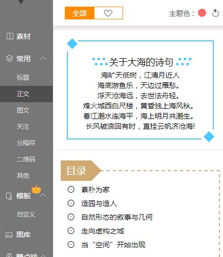 點(diǎn)擊最左邊的素材案例,選擇自己喜歡的素材,需要的素材,這邊右邊就會出現(xiàn)你所選擇的分類下面的素材。把鼠標(biāo)放到素材庫里面的素材上會出現(xiàn)一個素材框,是綠色的大框,大家可以點(diǎn)擊一下這個素材,然后選擇的素材就會自動添加到右邊的編輯框上面