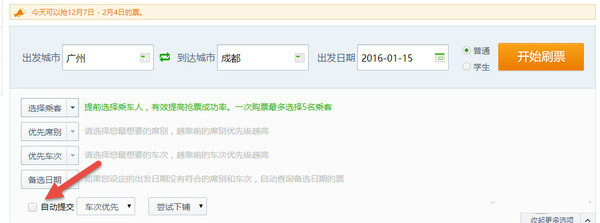 有些用戶可能刷了好久都沒有刷到一張票,總不能在那里干等吧,去喝杯茶或者上個廁所沒想到卻錯失了一張票,郁悶極了。這時,你就可以用到自動提交”功能,搶到票時可自動提交訂單,直至成功。你要做的就是付款操作了。