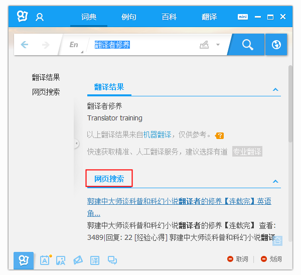 有道搜索引擎在抓取并獲得多達(dá)數(shù)十億的海量網(wǎng)頁(yè)數(shù)據(jù)后,利用有道獨(dú)創(chuàng)的“網(wǎng)頁(yè)萃取技術(shù)找出互為翻譯關(guān)系的中外文詞匯和句子,再通過優(yōu)化調(diào)整,得到最佳的翻譯結(jié)果。