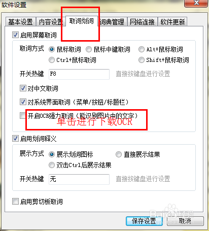 進(jìn)入軟件設(shè)置界面后,選擇取詞劃詞選項(xiàng),在取詞劃詞的選項(xiàng)中有一個(gè)下載OCR的選項(xiàng),單擊進(jìn)行下載。