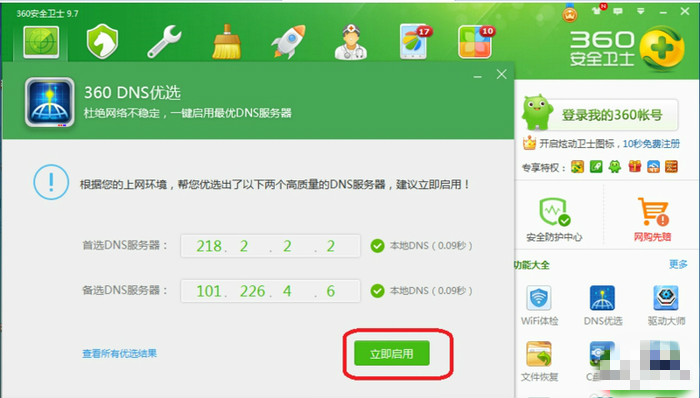 4、DNS優(yōu)選 如圖所示,打開殺毒軟件——點擊DNS優(yōu)選——點擊開始DNS優(yōu)選——立即啟用,效果如圖所示。
