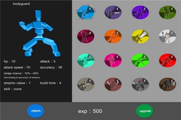 游戲目前有90各關(guān)卡,如果將所有戰(zhàn)士的等級升級到5,一種新的挑戰(zhàn)模式將開啟,游戲中有16個成就。在每一關(guān)開始前,你需要選出在游戲中使用的三種戰(zhàn)士,游戲開始后這些戰(zhàn)士會自動的生成與電腦生成的戰(zhàn)士對攻,你可以根據(jù)戰(zhàn)場的情況調(diào)整戰(zhàn)士的種類來獲得勝利。
