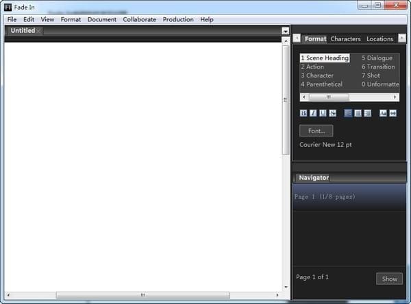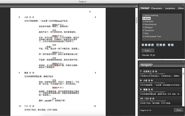 Fade In編劇軟件是一款非常好用劇本創(chuàng)作軟件,主要用于編劇們制作劇本使用,軟件可以獲取到系統(tǒng)所安裝的全部字體,在文字編輯上是沒(méi)有任何問(wèn)題的,而且支持導(dǎo)入和導(dǎo)出html、TXT、XML等多種格式,另外,為了讓你的劇本更加完美,軟件還為您準(zhǔn)備了多種主題風(fēng)格,如果不滿意,還能自己制作風(fēng)格,而且還有專(zhuān)門(mén)用于編寫(xiě)對(duì)話的工具,總之,有了它,你就可以制作出一份完美的劇本。【軟件特點(diǎn)】