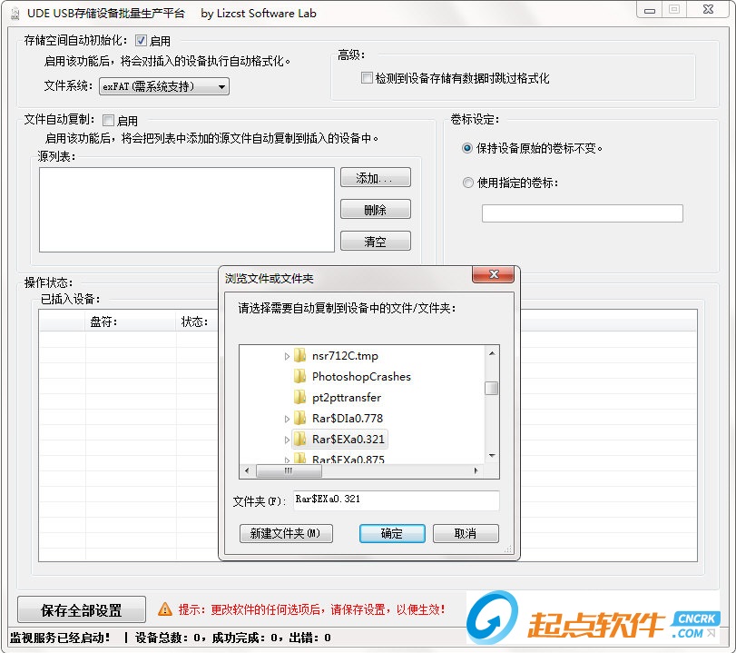 啟動軟件后,根據需要啟用所需的功能,對具體的功能進行設定,然后保存設置即可,此時便可以插入設備開始工作。1、自動格式化: