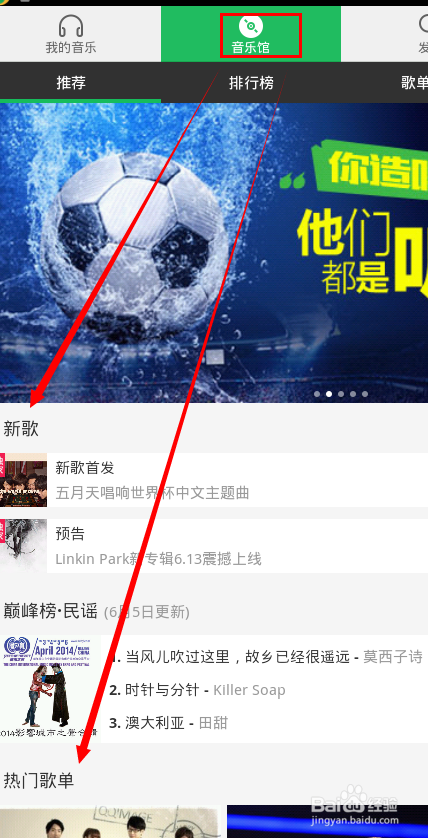 點擊音樂館默認進入推薦欄目還有排行榜等其他三個欄目,這個頁面有新歌、熱歌推薦等信息