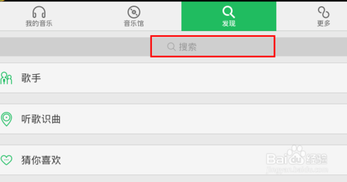 在發(fā)現(xiàn)欄目下有個搜索框可以搜索你要找的歌曲,也可以通過下面的歌手、聽歌識曲等找到自己喜歡的音樂