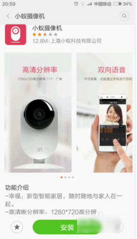根據(jù)小蟻智能攝像機(jī)包裝盒內(nèi)的說(shuō)明書(shū),通過(guò)二維碼掃描來(lái)下載“小蟻APP”或“小米智能家庭APP”安卓版手機(jī)程序。