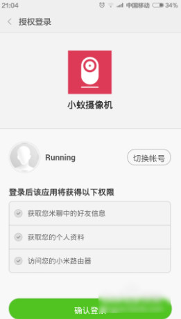 接下來(lái)為小蟻智能攝像機(jī)接觸電源,待指示燈呈黃色閃燈時(shí),打開(kāi)手機(jī)APP,并連接到周?chē)籛IFI網(wǎng)絡(luò)下。在此以“小蟻APP”為例,從打開(kāi)的程序主界面中點(diǎn)擊“小米登陸”按鈕,利用小米賬號(hào)完成登陸操作。