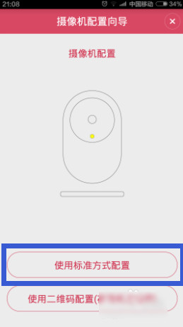 接下來(lái)將提供兩種連接小蟻攝像機(jī)的方法,有“使用標(biāo)準(zhǔn)方式配置”和“使用二維碼配置(夜視版推薦)”,在此小編點(diǎn)擊“使用標(biāo)準(zhǔn)方式配置”按鈕。