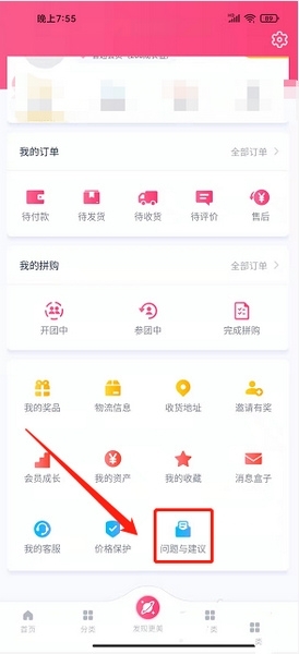 2. 來(lái)到“我的”界面,點(diǎn)擊【問(wèn)題與建議】選項(xiàng)。