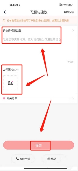 3、來(lái)到問(wèn)題與建議界面,挑選問(wèn)題類型、錄入吐槽內(nèi)容,并上傳照片,隨后點(diǎn)擊【提交】。