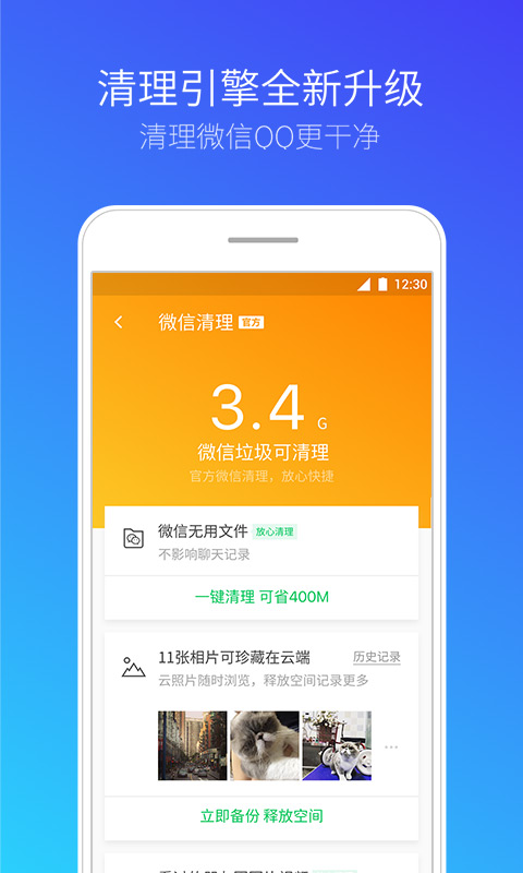 騰訊手機管家動態(tài)守護手機安全,深度清理微信、QQ緩存,讓手機體積減半,拒絕卡慢。更有海量游戲禮包,騰訊大王卡流量特權等你拿。