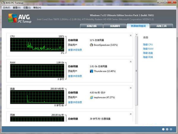 AVG PC Tuneup是知名的反病毒軟件之一。這是該公司推出的一款PC維護類軟件,專注于性能優(yōu)化、修復和清理。軟件提供一站式解決方案,支持幾乎所有PC維護方面的必要功能,包括性能改善建議和安全建議。還能監(jiān)控各種系統(tǒng)資源的使用情況。支持簡體中文界面,32位和64位操作系統(tǒng)。