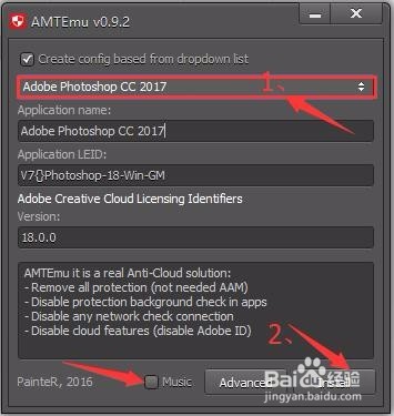 在注冊機第一個選項卡中選中Adobe Photoshop CC2017,然后點擊Install。親測可以破解CC2018