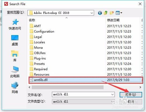 打開C:\Program Files\Adobe\Adobe PhotoshopCC 2018文件夾,選擇軟件根目錄下的amtlib.dll,點擊打開。
