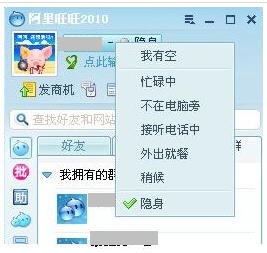 在阿里旺旺上的主界面,點(diǎn)擊最上部的您的旺旺用戶名,在彈出的下拉框里面選擇想要的狀態(tài)即可。