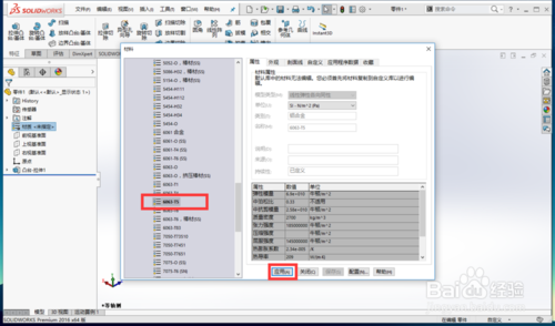 在彈出的“材料”選項卡中選擇你要設(shè)置的模型材料。在這里指定為鋁合金6063-T5,并點擊“應(yīng)用”。這時就會發(fā)現(xiàn),之前的“材質(zhì)”已經(jīng)變?yōu)椤?063-T5”,而且模型的外形顏色也發(fā)生了變化,說明材質(zhì)設(shè)置成功。