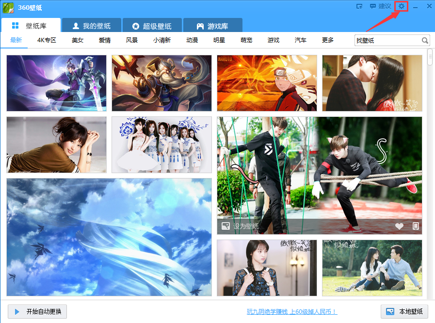 360壁紙開機(jī)啟動項(xiàng)設(shè)置方法首先打開360壁紙,在右上角找到設(shè)置選項(xiàng)。