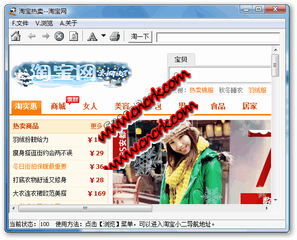 淘寶購物瀏覽器 V3.0 簡體中文綠色免費版 軟件使用簡單,通過【瀏覽】菜單中的導(dǎo)航菜單進入分類列表。