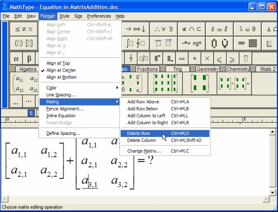 與公式編輯器不同,MathType軟件可以通過新增的矩陣菜單中的命令來增加或刪除矩陣/表格中的行或列。