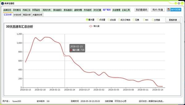 15、直通車(chē)數(shù)據(jù)(一鍵查看直通車(chē)匯總、計(jì)劃、商品、關(guān)鍵詞的曝光、點(diǎn)擊、點(diǎn)擊率、成交、花費(fèi)、ROI、交易額趨勢(shì)圖)