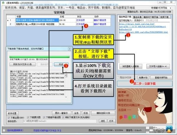 本軟件是目前淘寶上功能全面的商品圖片下載軟件(輕松實現(xiàn):淘寶圖片批量下載、淘寶商品大圖下載 ),極大的方便的店主對店鋪的素材管理。 此軟件可以一鍵下載阿里系列寶貝圖片包含主圖(sku)、展示圖 、細節(jié)描述圖等,同時該軟件也支持速賣通圖片下載、京東網(wǎng)圖片下載、蘇寧易購圖片下載、唯品會商品圖片下載、一號店商品圖片下載等,能有實現(xiàn)多個鏈接同時同步下載。