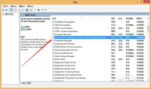 在彈出的如圖的對話框中,找到Corel License Validation Service V2 x64, Powered by arvato服務(wù)(也可以直接講鼠標(biāo)點(diǎn)一下任意一個服務(wù),然后輸入英文C)