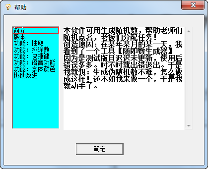 1.0 除了隨即數(shù)生成器 具有的多用戶功能沒有?(太麻煩了!)其他都由于。附帶一個(gè)快速隨機(jī)數(shù)(可給PPT快速點(diǎn)名?。?br />1.1 改了一點(diǎn)小細(xì)節(jié)!1.2 隨機(jī)數(shù)字生成器正式發(fā)布版 更正程序邏輯,修復(fù)已發(fā)現(xiàn)錯(cuò)誤,解決誤報(bào)!增加快捷鍵功能! 因?yàn)槲业拇中模景姹居写箦e(cuò)誤
