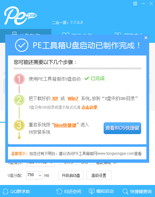 到此,通用pe U盤啟動(dòng)盤就已經(jīng)制作完成了,接下來就是如何使用剛剛制作的通用pe U盤裝系統(tǒng)了!