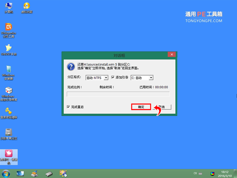 到此,還原完畢了,此時(shí)的這個(gè)完成窗口只會(huì)逗留片刻,無需我們點(diǎn)擊完成按鈕,它會(huì)自動(dòng)重啟電腦了。到此我們屬于通用pe做的事就完成了,接下 來就是系統(tǒng)自己的事了。