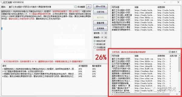 4等搜索完(或者直接點(diǎn)擊“查看詳情”)看搜索的過程以及最后返回的某個文章出現(xiàn)的次數(shù)(點(diǎn)擊次數(shù)對應(yīng)的行,出現(xiàn)對比窗口,對文章進(jìn)行比對),一般次數(shù)最多的,基本你的文章和這頁有相同的地方也多!