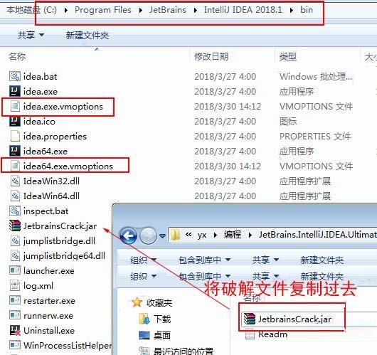 6、安裝完成后,先不要打開(kāi)軟件,將破解文件“JetbrainsCrack.jar”復(fù)制到軟件安裝目錄【C:\Program Files\JetBrains\IntelliJ IDEA 2018.1\bin】;