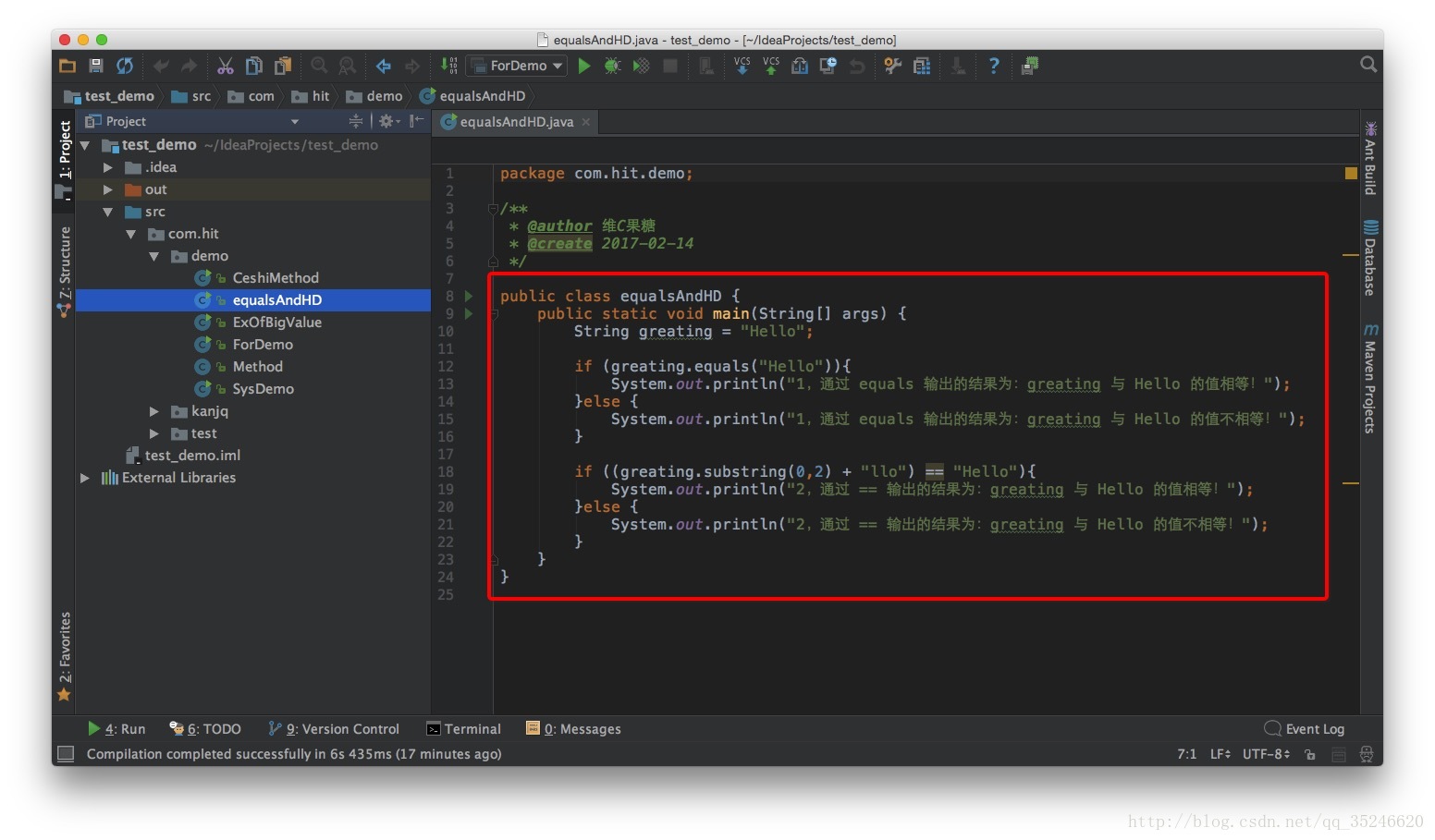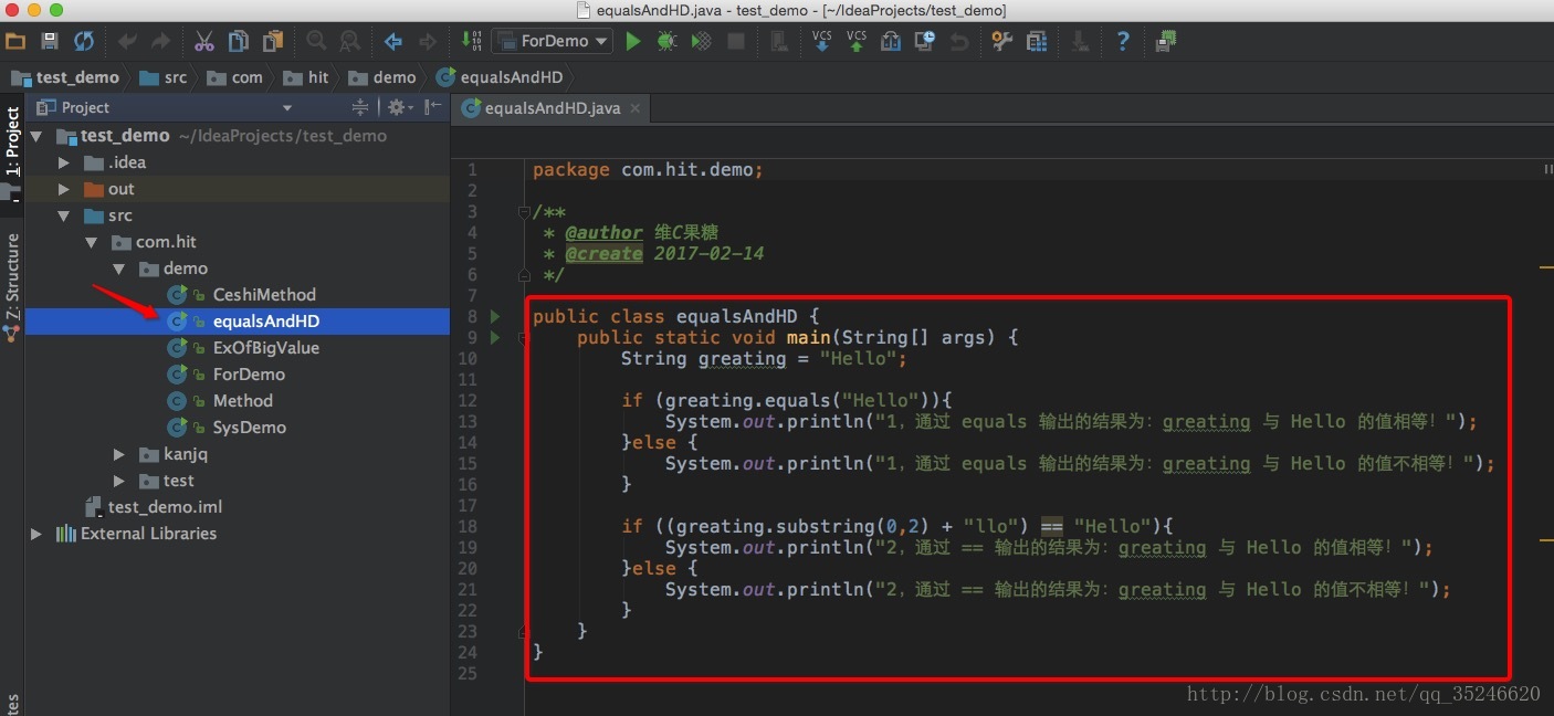 如上圖所示,這是博主之前寫的測(cè)試恒等運(yùn)算符和equals()區(qū)別的測(cè)試類。接下來(lái),咱們?cè)谶@段代碼中添加一條輸出語(yǔ)句: