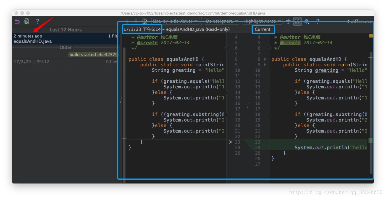 如上圖所示,最左邊展示了版本記錄,由于博主僅進(jìn)行過(guò)這一次修改,因此這里只顯示了2 minutes ago的版本記錄;在往右看,依次展示了前一版本與當(dāng)前版本的代碼,并給出了區(qū)別,可謂是清晰簡(jiǎn)潔: