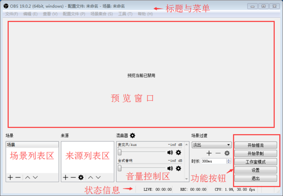 1、打開(kāi)主界面主界面場(chǎng)景:場(chǎng)景相當(dāng)于PS作圖,場(chǎng)景是主圖,來(lái)源是圖層,你可以多設(shè)置幾種不同的畫(huà)面