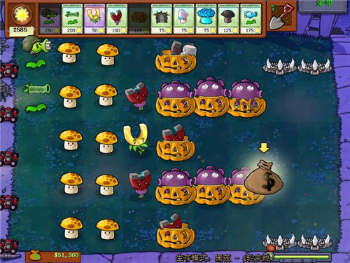 6、現(xiàn)在開始我們就種磁力菇,隨你種吧,只要不被僵尸吃到,隨便種。不過要是普通模式,磁力菇就用不著了。就這6個(gè)郁悶?zāi)⒐骄透愣?,不夠?個(gè),8個(gè)一定夠!