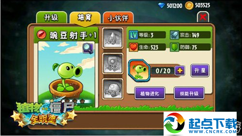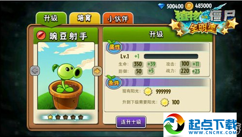 通過消耗陽光,對單個植物進行升級。升級后,植物的三種屬性均會提升。
