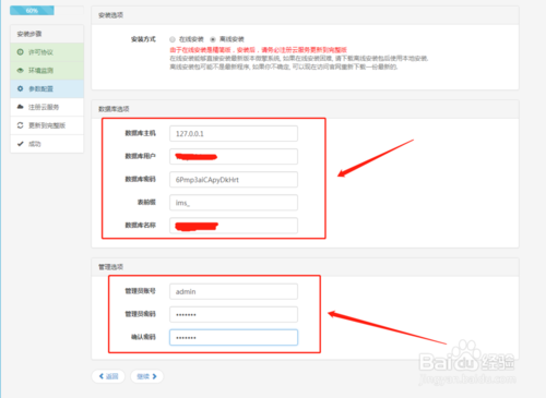 填寫數(shù)據(jù)庫選項,管理選項,點擊繼續(xù)。