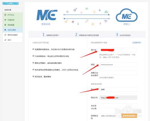 在注冊云服務(wù)的頁面填寫在微擎官方網(wǎng)站注冊的帳號密碼,等需要填寫的信息開通微擎的云服務(wù)