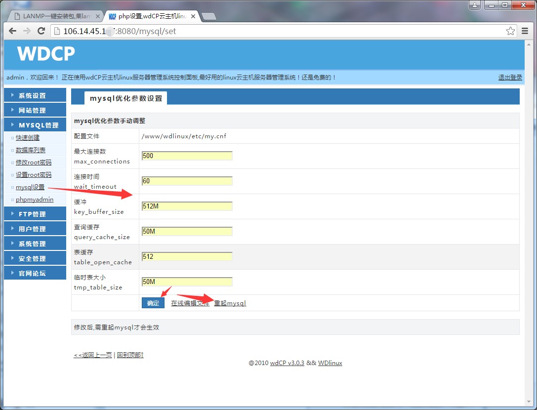 4:mysql管理 -> mysql設(shè)置 -> 設(shè)置成圖片的數(shù)值 -> 確定 -> 重啟mysql。設(shè)置參數(shù)如圖