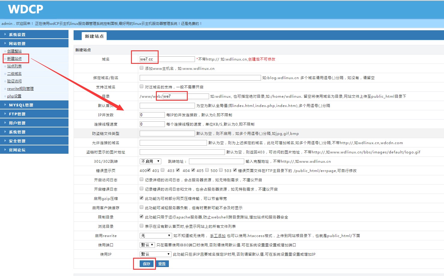 5:新建站點 -> 填寫自己的域名 -> 默認的位置we7 -> 保存
