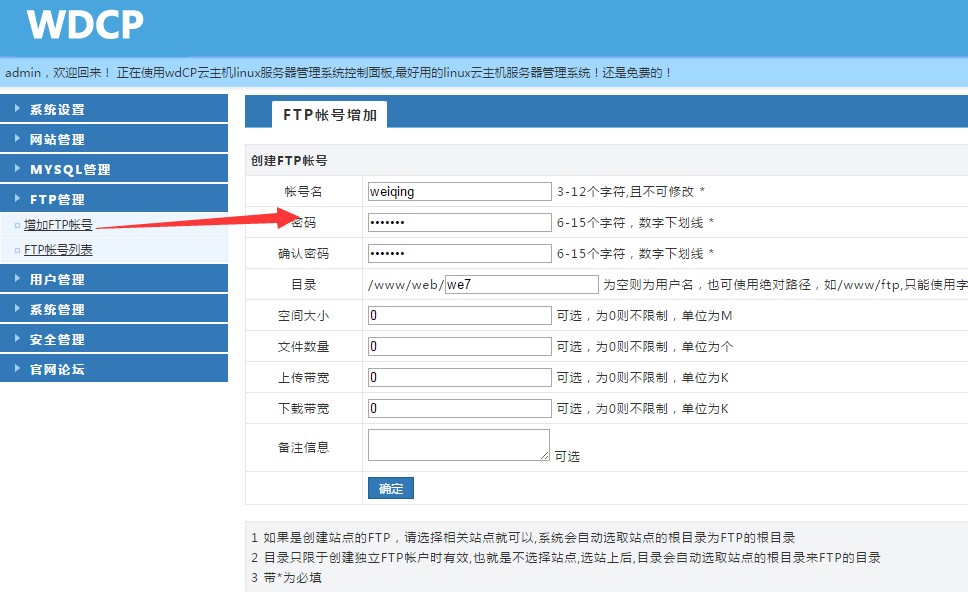 6:建立FTP -> 增加FTP賬號 -> 填寫完成確定即可