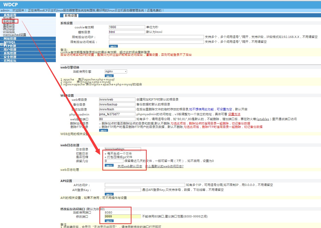 8:保留web日志 -> 修改端口 -> 確定保存